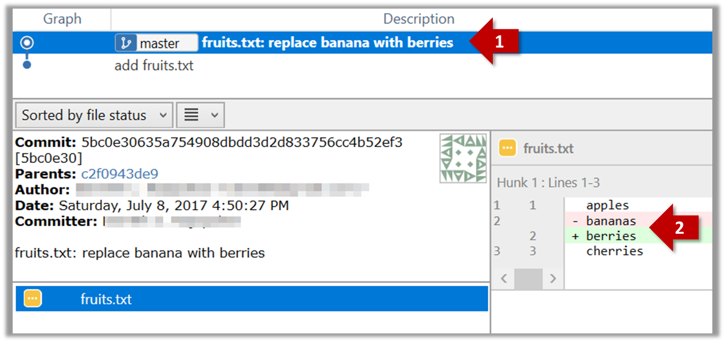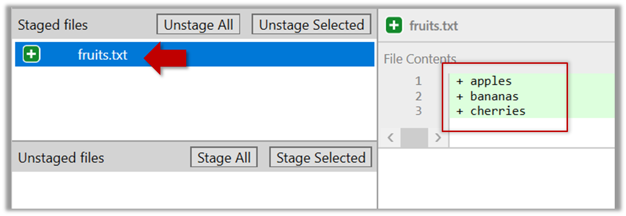 Do some changes to fruits.txt (e.g. add some text and delete some text). Stage the changes, and commit the changes using the same steps we followed before. You should end up with something like this.