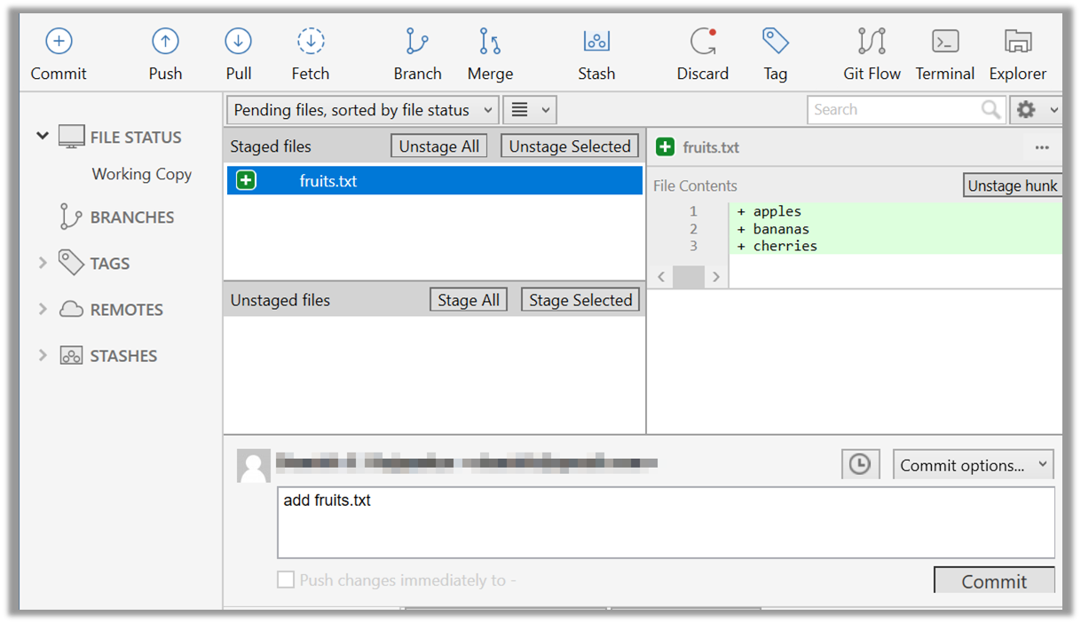 Click the Commit button, enter a commit message e.g. add fruits.txt in to the text box, and click Commit